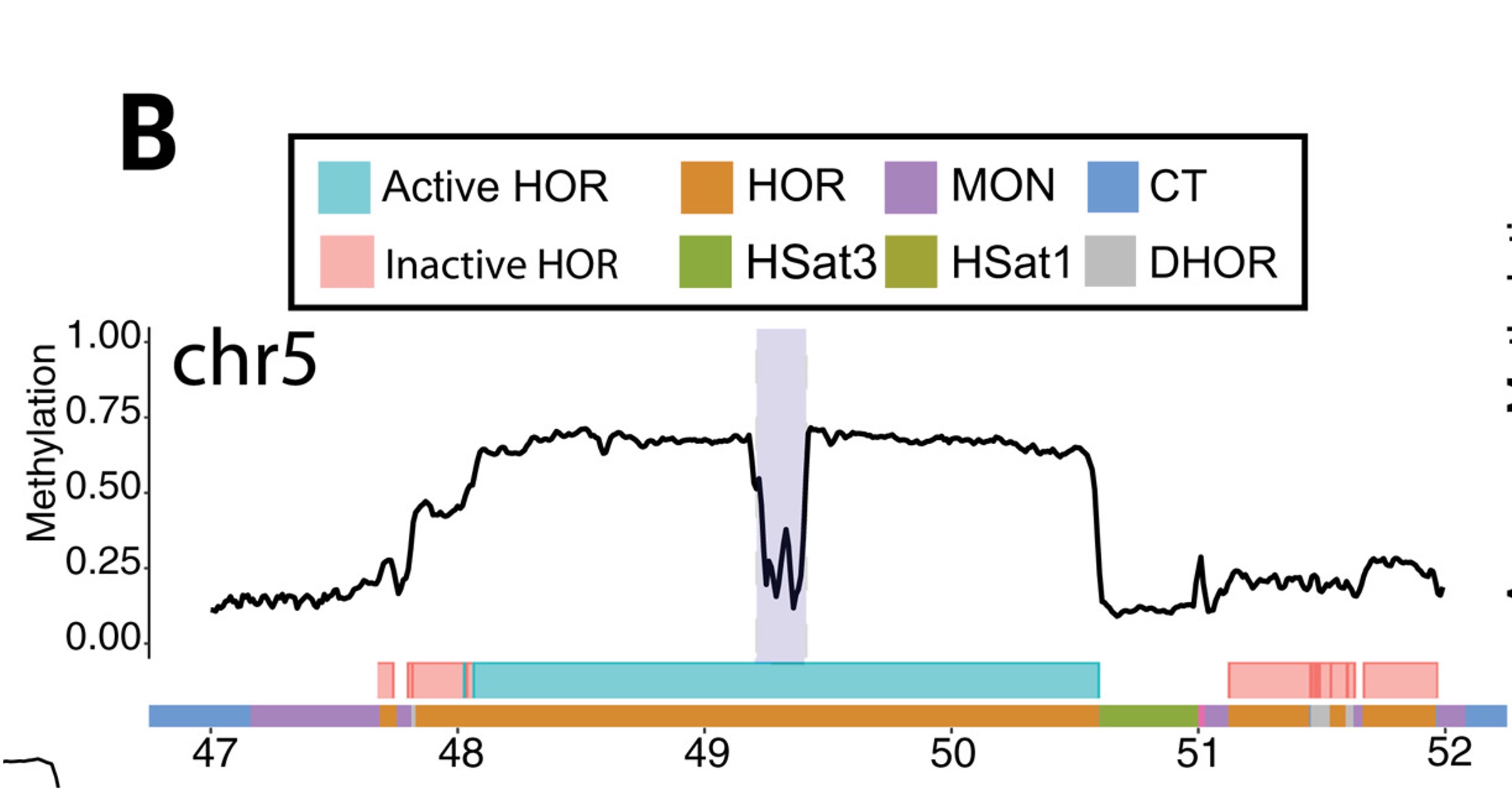 Fig.1 CHM13 methylation in the centromeric region of chromosome 5. Smoothed methylation frequency is plotted in 10-kb bins. HOR arrays are annotated as blue (“active”) and pink (“inactive”).1.