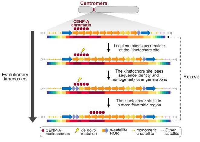 To answer centromere paradox, Gao et al.’s 4findings provide the foundation for a unified model in which (i) kinetochores preferentially form on homogenous stretches of α-satellite HORs; (ii) those stretches are prone to elevated rates of homologous recombination and structural change because their sequence identity promotes misalignment and unequal exchange; and (iii) such genetic changes feed back on chromatin state and kinetochore localization, producing continual shifts in centromere architecture across generations (an evolutionary “treadmill” of DNA-protein interactions).